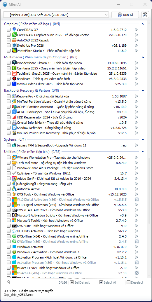 Shop MinhPC cung cấp bộ AIO Soft dạng phần mềm Silent & Repack cho Windows để cài nhanh các phần mềm cần thiết cho Windows khi mới cái Windows mới với các ứng dụng phổ biến hay dùng cho Windows và các ứng dụng tiện ích như đồ họa, thiết kế, multimedia….tất cả dưới dạng đã kích hoạt sẵn.